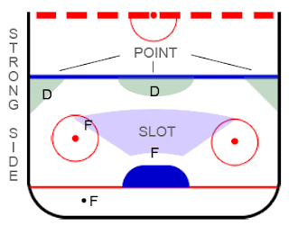 A good way to go about positioning is to place your two defensemen right at the point (the top of the zone along the blue line). The defensemen need to stay at the point in order to not only prevent the other team from passing it up the boards if they end up stealing the puck, but they will also be there to help move the puck around, and if allowed, rip a slap shot. If a defenseman ends up taking a shot, the forwards need to make sure some one is there to either screen the goalie or pick up the rebound and make an easy goal.