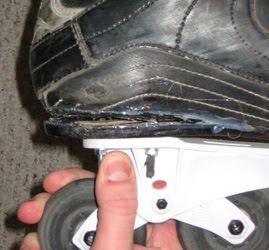 After going through this laborious process I couldn’t wait to give them a try. Unfortunately, it only took four or five games before my boots ended up ripping away from the sole. I’m not sure why this happened but I can think of a few reasons. First, the Mission boots were originally from my old, very used inline skates and I think this weak boot was far too flexible for the chassis. Second, the head of the bolts had sharp edges so they ended up ripping through the inside of the boot. Perhaps a round head bolt or a set of washers would have remedied this. Third, the bolts ended up being far too long, making them difficult to tighten all the way. Last, the bolts on the toe were very hard to reach in order to sufficiently tighten them.